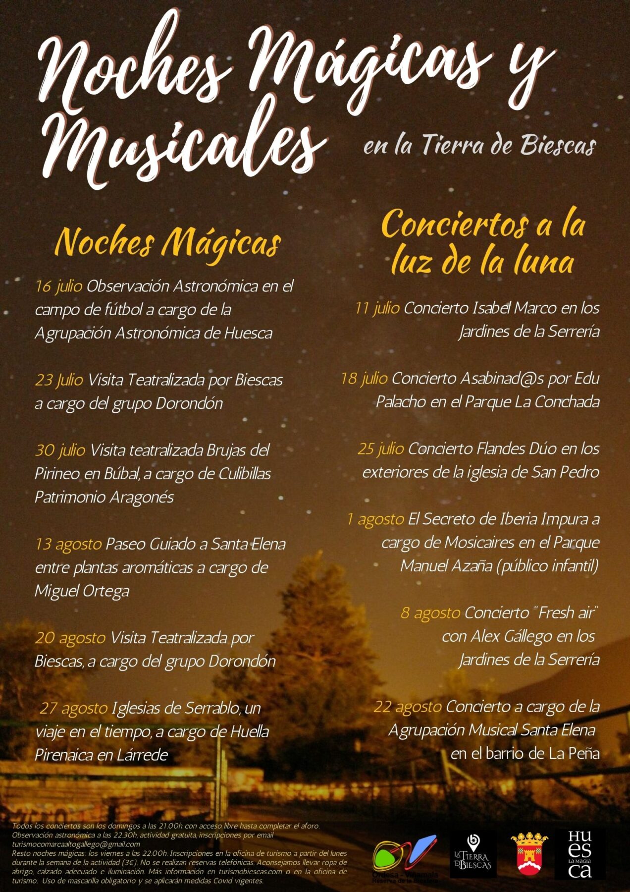 Leer más »Durante los meses de julio y agosto las noches de los fines de semanas en Biescas serán diferentes gracias al ciclo ‘Nochés Mágicas y Musicales‘. Los viernes es el turno de las Noches Mágicas de Biescas, una selección de visitas y paseos llenos de magia con los que descubrir el patrimonio que rodea a ésta localidad pirenaica, la historia, las leyendas o la naturaleza. Noches Mágicas Biescas 16 julio: Observación Astronómica en el campo de fútbol a cargo de la…