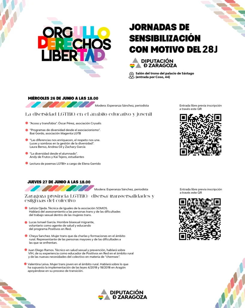 La segunda jornada, «Zaragoza provincia LGTBIQ+ diversa: transversalidades y estigmas del colectivo», tendrá lugar el jueves 27 de junio y contará con la participación de Letizia Ojeda (asociación SOMOS), Lucas Ismael García, Cheya Sanchez, Juan Diego Ramos y Valentina Leiva.