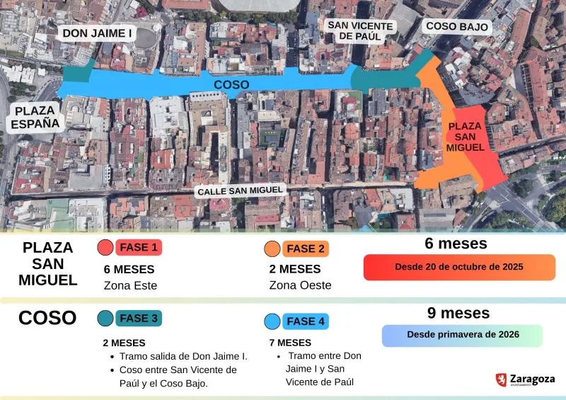 El Ayuntamiento de Zaragoza pondrá en marcha el próximo lunes 20 de octubre un plan de movilidad por las obras en la plaza de San Miguel, que se prolongarán durante seis meses. Los trabajos forman parte de la reforma integral del Coso y la plaza, con un plazo total de quince meses y una inversión superior a siete millones de euros.