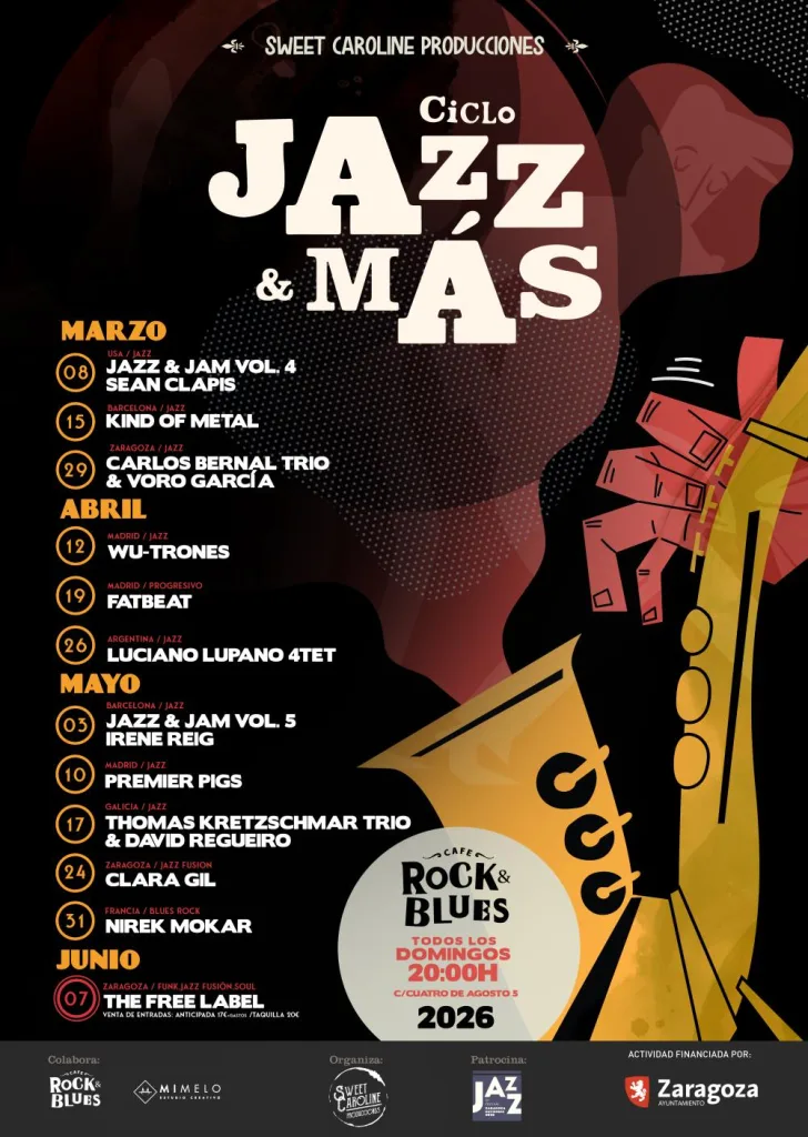 La novena edición de Jazz & Más en Rock & Blues Zaragoza volverá a reunir a músicos nacionales e internacionales en la sala zaragozana durante los próximos meses. El ciclo comenzará el domingo 8 de marzo y se prolongará hasta el 7 de junio con doce actuaciones.