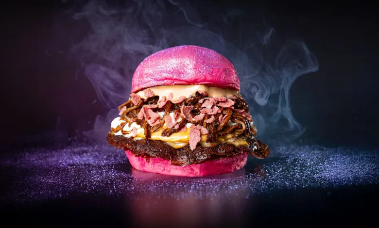 Pink Paradise destaca por una propuesta muy reconocible desde el primer vistazo: pan brioche rosa y una combinación pensada para competir en formato premium. La receta incluye fat smash de chuletón, carrillada ibérica cocinada a baja temperatura, guanciale caramelizado, queso chédar madurado, crema agria, beicon crujiente y salsa Malibú.