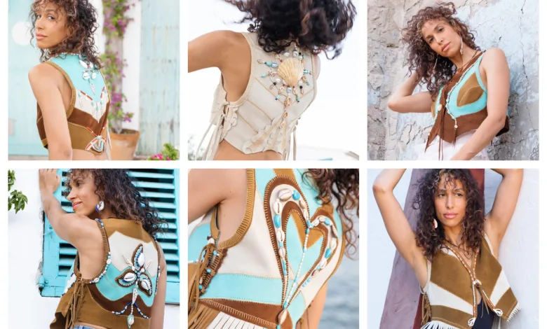 Las prendas estĆ”n realizadas en serraje de primera calidad, un material elegido por su resistencia y por la delicadeza de su acabado. Sobre esa base, la creadora construye composiciones en las que conviven elementos naturales y piedras semipreciosas, con un resultado que sitĆŗa cada pieza entre el vestuario, la joyerĆa y el trabajo artĆstico.