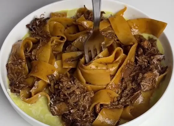 La cocción se alarga durante una hora y media, a fuego bajo. El objetivo es lograr una carne que se deshaga con facilidad y una salsa densa, pensada para envolver la pasta.