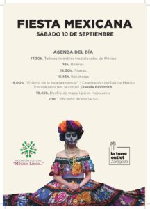 Como no podía ser de otra manera, La Torre Outlet Zaragoza y la Asociación México Lindo han preparado una serie de actividades que tendrán lugar el sábado 10 de septiembre en las instalaciones del complejo outlet, con las que conmemorar el Día de México. Todos los actos son gratuitos y abiertos al público. Además, el complejo Outlet contará con la presencia de la Cónsul de México en Barcelona, Doña Claudia Pavlovich.
