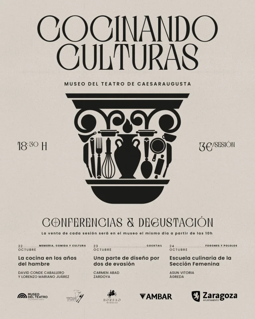 El ciclo “Cocinando Culturas”, organizado por Zaragoza Museos y dedicado a divulgar la gastronomía a lo largo de la historia, abordará este año la gastronomía de los años 40 y 50. Se celebrará entre el martes 22 y jueves 24 de octubre a las 18h30 en el Museo del Teatro de Caesaraugusta. Todas las sesiones empiezan con una conferencia que tiene una duración estimada de 45 minutos, celebrada en el salón de actos del museo y, posteriormente, una degustación en la terraza de la segunda planta. Las entradas tienen un precio de 3 euros por sesión y se pueden adquirir el mismo día a partir de las 10h en la recepción del museo. Los ponentes de este año son David Conde Caballero, Lorenzo Mariano Juárez, Carmen Abad Zardoya y Asun Vitoria Ágreda.