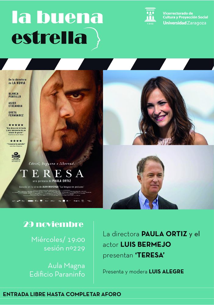 La sesión 229 de La Buena Estrella con ‘Teresa’ de Paula Ortiz se celebrará el miércoles 29 de noviembre a las 19:00 h. en el Aula Magna del Paraninfo de la Universidad (Plaza Basilio Paraíso) y será moderado por el escritor, periodista y profesor de la Universidad de Zaragoza Luis Alegre. La entrada es libre hasta completar el aforo.
