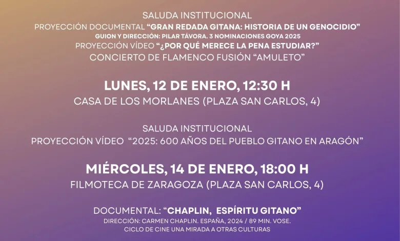 La conmemoración continuará el lunes 12 de enero en la Casa de los Morlanes, a las 12.30 horas, con un acto institucional presidido por la consejera de Políticas Sociales, Marian Orós. En este encuentro participarán entidades representativas de la población gitana en Zaragoza y se difundirán imágenes de las actividades realizadas en 2025 por el 600 aniversario de la llegada del pueblo gitano a la Península Ibérica a través de Aragón.