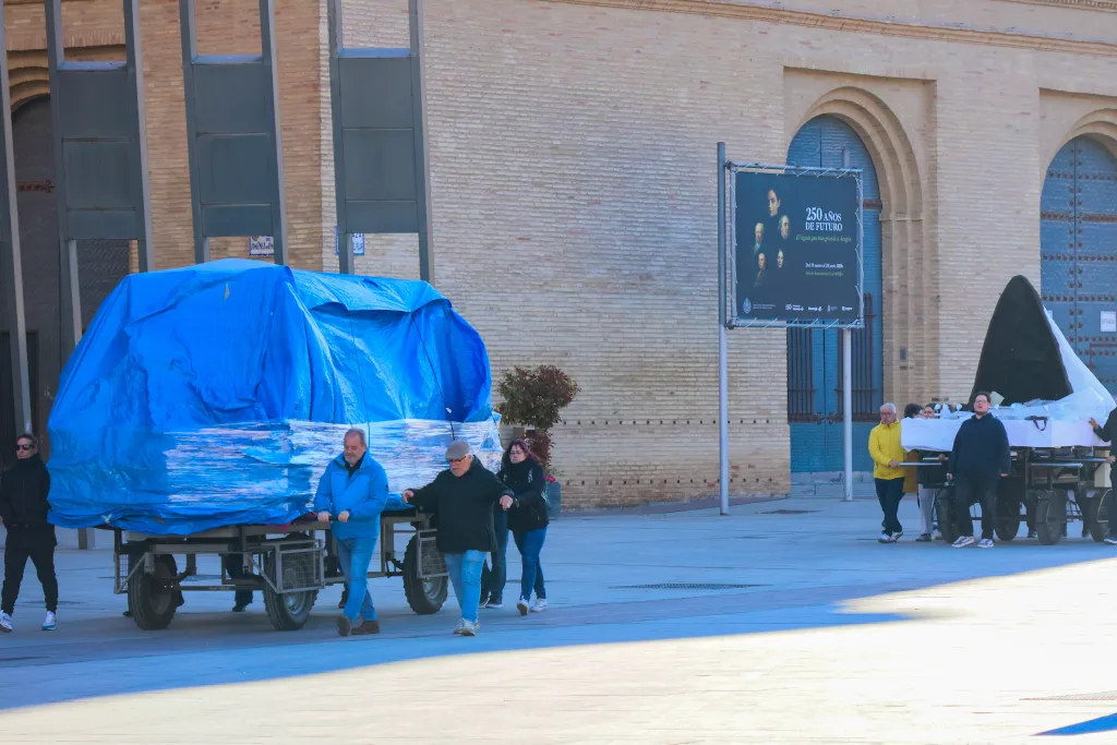 Carrozas y peanas van abandonando su lugar de almacenamiento de forma escalonada, bajo la supervisión de la Policía Local, que regula el tráfico en la zona. Los pasos salen cubiertos, aunque muchos zaragozanos reconocen fácilmente algunas escenas. Entre ellas, la Entrada de Jesús en Jerusalén, el Descendimiento o la Verónica.