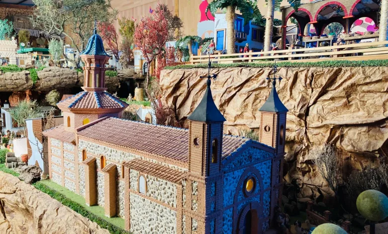 Quienes lo visiten encontrarán una escena muy amplia y elaborada que recrea un pueblo tradicional con edificios de piedra, fachadas de colores y tejados de teja. Destaca una representación en maqueta de la ermita de la Virgen de la Fuente de Muel, además de áreas naturales con árboles, palmeras, musgo y zonas rocosas. Una sección acuática con puentes de madera, barcas y una torre aporta una ambientación de puerto que llama la atención en la panorámica general.